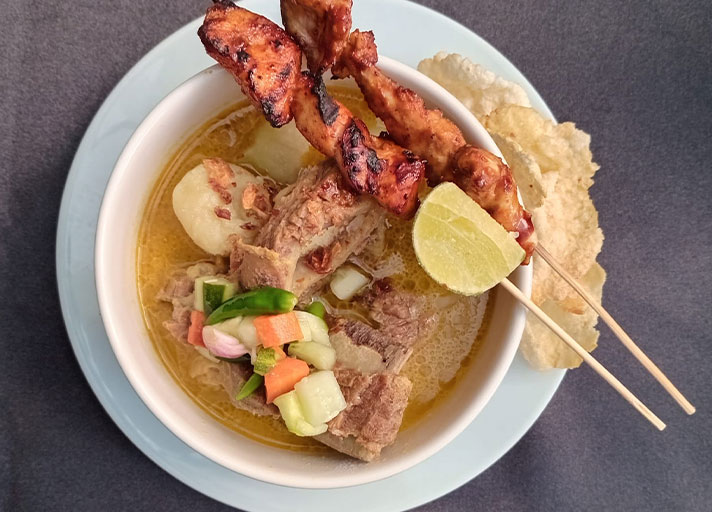 Gule iga, nasi/lontong, sate ayam, emping, acar, sambal, pisang salju ayu, ice lemon tea / ice tea