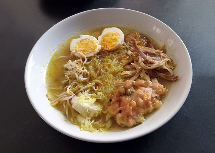 Soto irisan ayam, nasi/lontong, telur rebus, perkedel, sambal & kerupuk udang, pisang salju ayu, ice lemon tea / ice tea